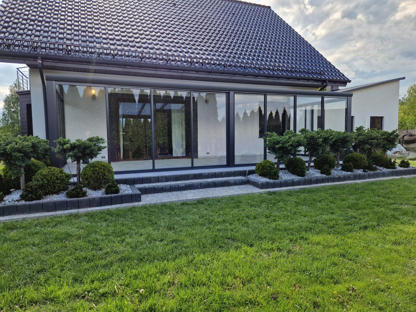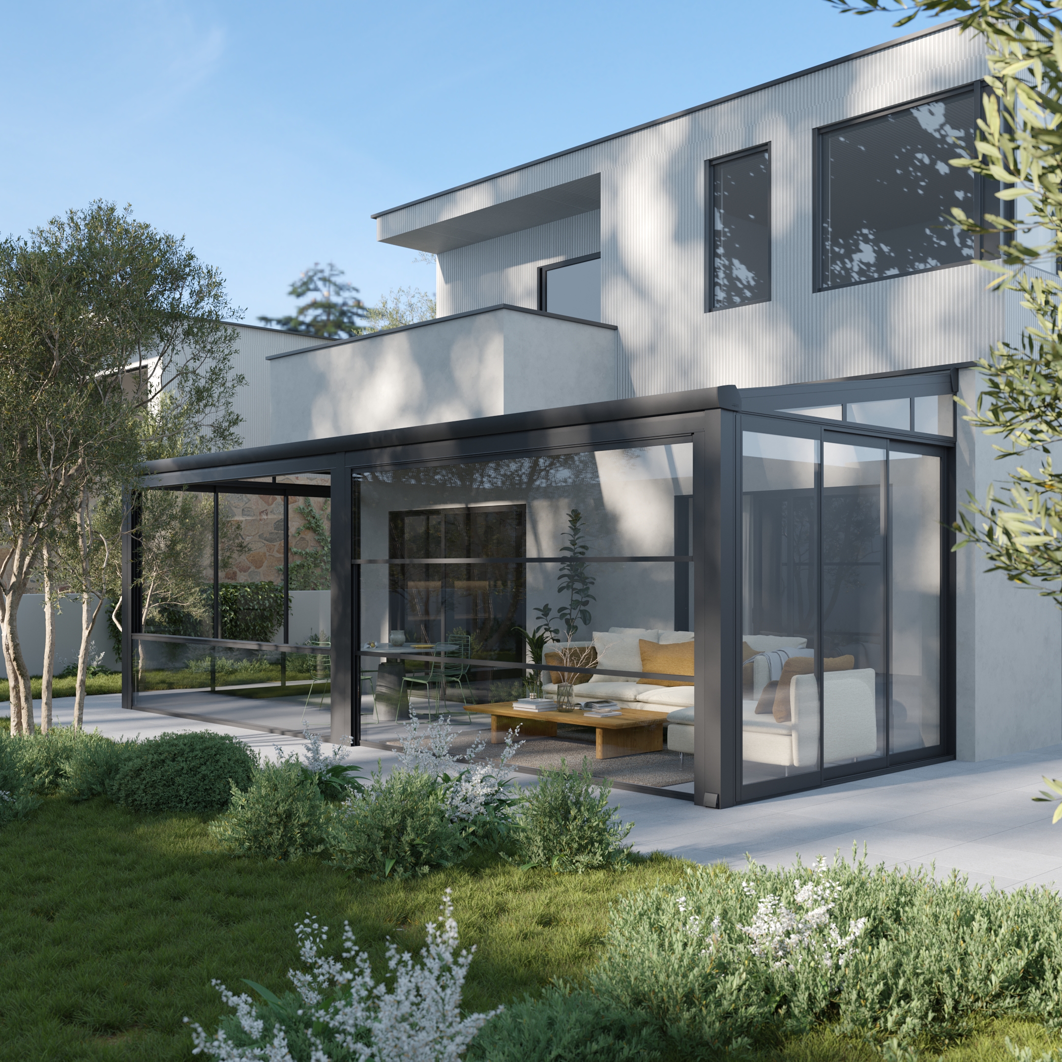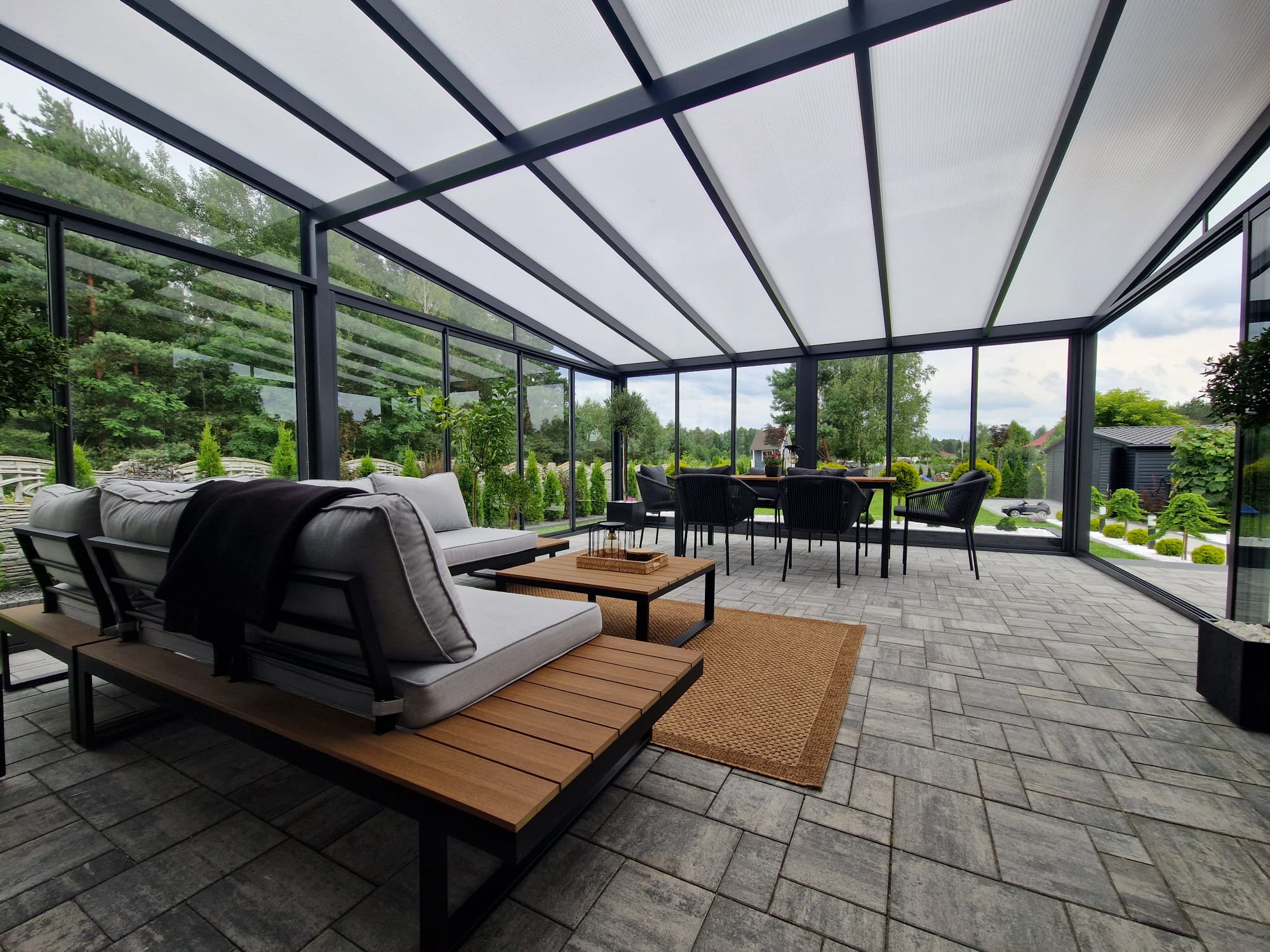 Pergola aluminiowa przyścienna w kolorze antracytowym, bez zabudowy ścian, z dachem z poliwęglanu komorowego 16 mm (7-komorowego) z filtrem UV, dostępna w wersji przezroczystej lub mlecznej; cena brutto za materiał (VAT 23%).